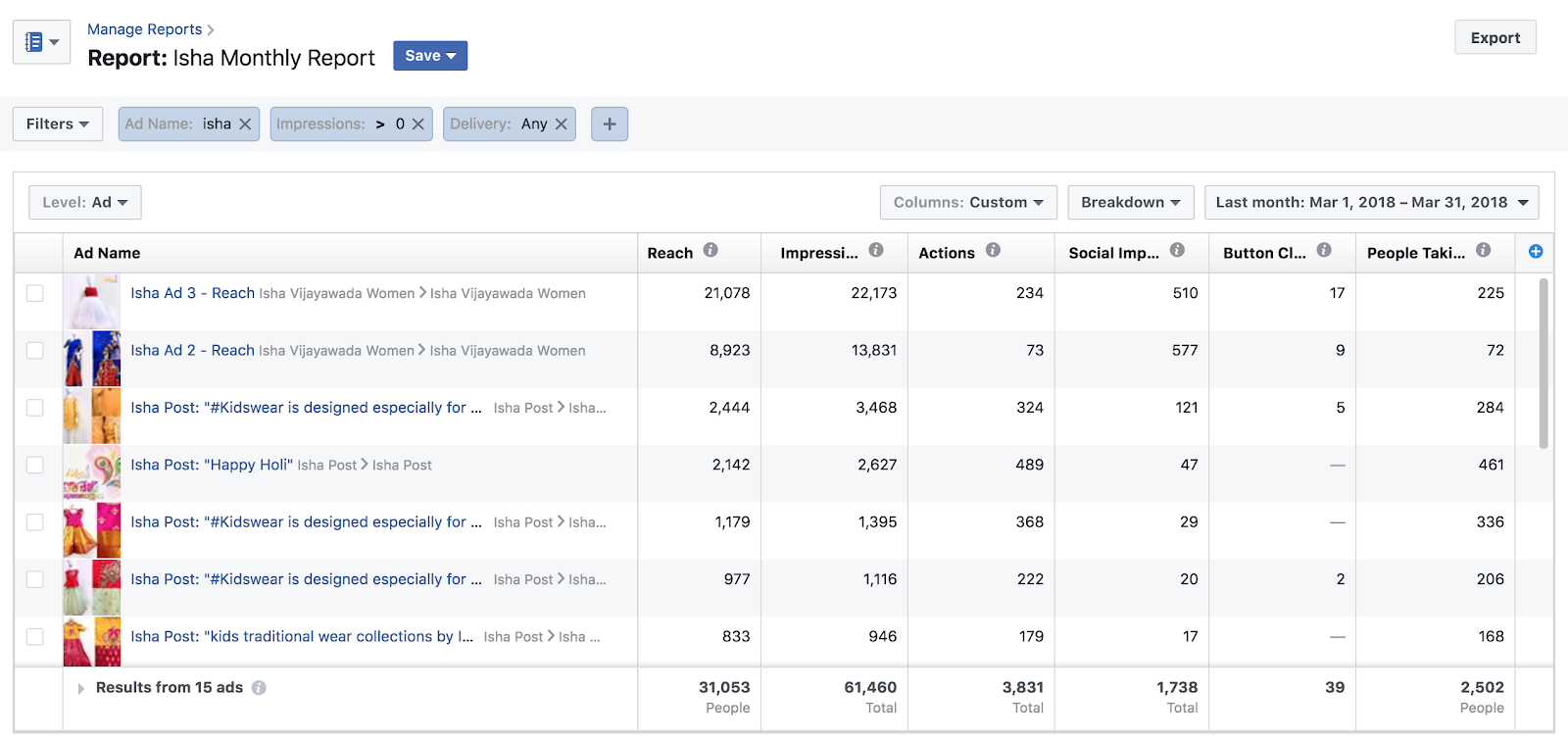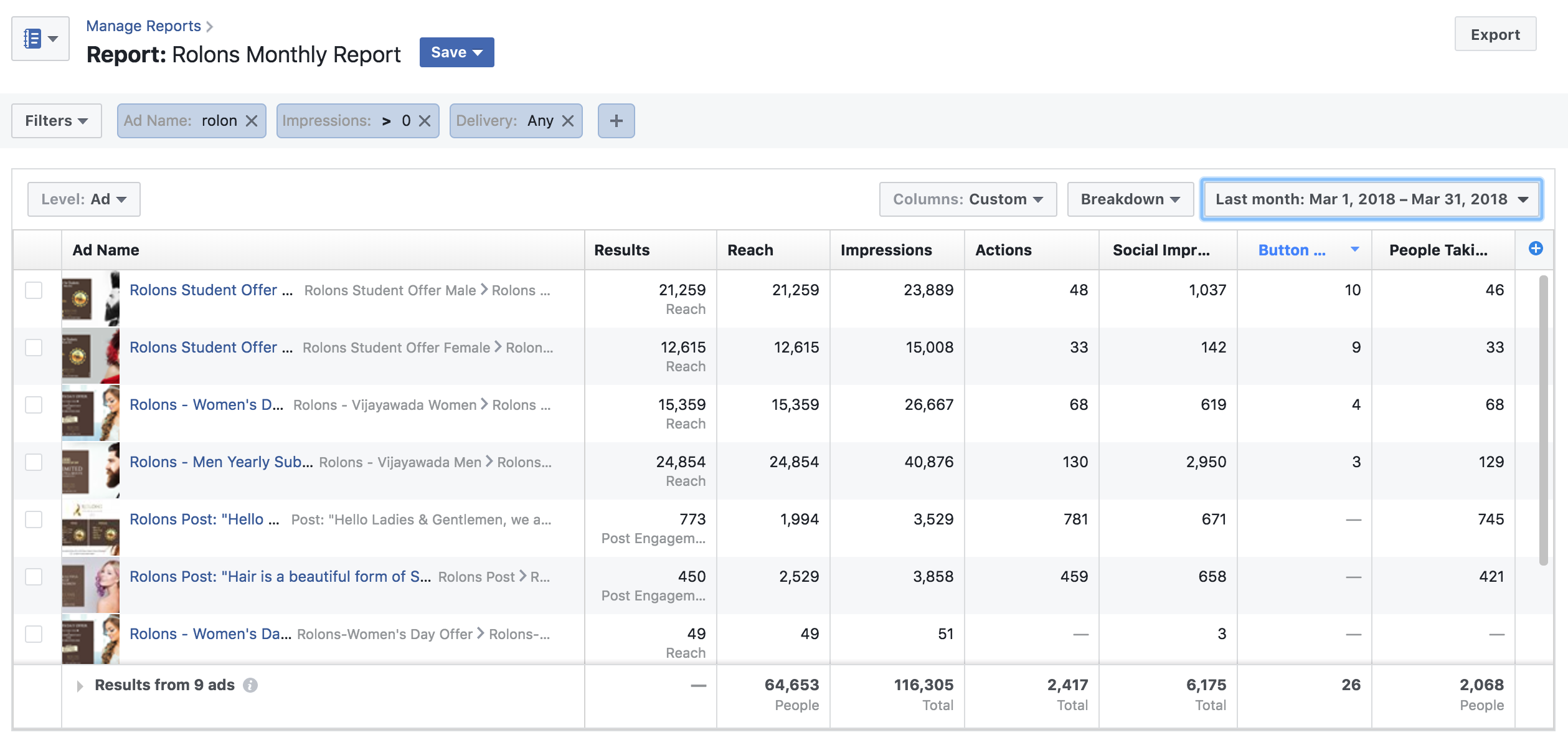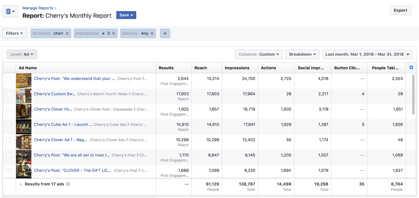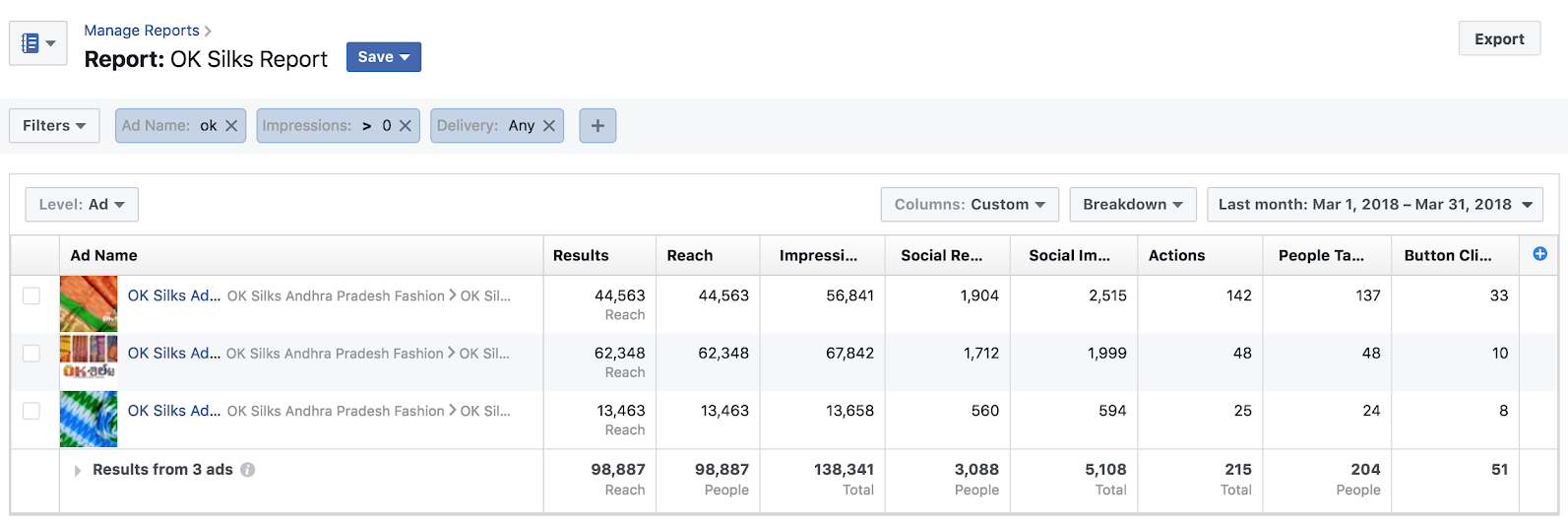 Impressed with the kind of reach that we got for their business inaugurations, we are handed over the entire facebook promotions of all their four verticals - Sweets, Restaurant, Gift Articles & Banquet Hall. Please find below a screenshot of the reach & leads that we generated for the month of Mar 2018